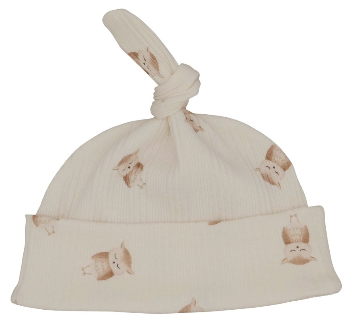 Een schattig baby knoopmutsje voor de allerkleinsten. Een mutsje in een warme ecru kleur met een printje van schattige uiltjes, gemaakt van een leuke onregelmatige ribstof. Pasgeboren baby’s kunnen nog niet zo goed hun eigen temperatuur reguleren en koelen via hun hoofdje snel af. Daarom is een mutsje extra fijn en houd je het hoofdje van je baby lekker warm. Het babymutsje is elastisch en wordt gemaakt van super zacht jersey/tricot. Hierdoor draagt het heerlijk zacht en comfortabel en heeft je kleintje geen last van het mutsje. Het is een heerlijk basis item wat echt onmisbaar is in de baby garderobe. Het mutsje heeft een brede band zodat het hoofdje van je kleintje lekker warm blijft. Je kunt de band naar keuze smaller en breder omslaan. De knoop aan de bovenkant kun je ook verstellen, zodat je het mutsje groter of kleiner kunt maken.