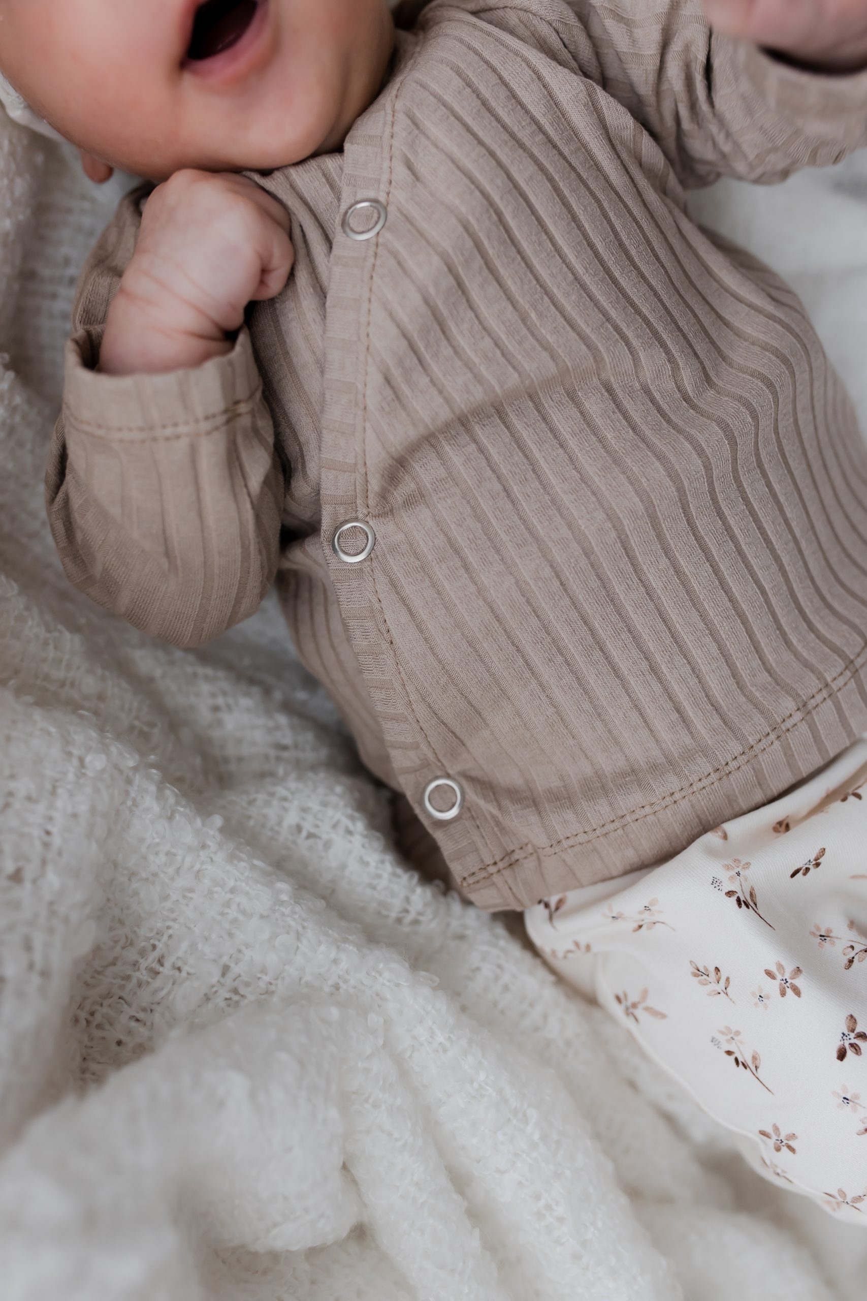 Een super schattig baby overslagshirtje voor je kleintje. Een overslagshirtje in een mooie neutrale donker beige kleir in een leuke brede rib. Het baby overslagtruitje is gemaakt van super zacht jersey/tricot. Het is goed rekbaar en draagt heerlijk zacht en comfortabel en je kleintje kan zich er makkelijk in bewegen. Doordat het een overslagshirtje is hoef je het niet over het hoofdje van je kleintje te trekken. Zo kun je je baby makkelijk aan- en uitkleden. Het overslagshirtje brede rib donker beige heeft aan de buitenkant drie drukknoopjes. Aan de binnenkant zitten twee drukknoopjes zodat het newborn baby overslagshirtje mooi blijft zitten. Let op dat je niet aan de stof trekt als je de drukknopen openmaakt.