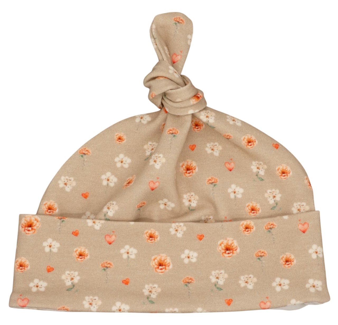 Newborn mutsje in een zandkleur met kleine bloemetjes.