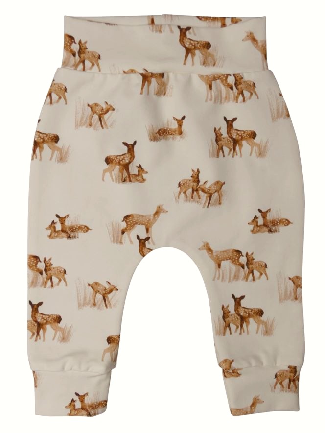 Een schattig babybroekje voor de allerkleinsten. Een crèmekleurig broekje met een leuke print van schattige hertjes. Het newbornbroekje is gemaakt van super zacht jersey/tricot. Hierdoor is het goed rekbaar en draagt het heerlijk zacht en comfortabel en kan je kleintje zich er makkelijk in bewegen. De stevige tricot pilt en lubbert niet en blijft ook na het wassen super mooi. Het babybroekje heeft aan de bovenkant een zachte, elastische tailleband die makkelijk mee rekt met aan- en uitkleden van je kleintje. Het broekje heeft aan de bovenkant wat extra ruimte zodat ook de luier van je kindje er prima inpast. Aan de onderkant heeft het broekje boordjes zodat het mooi aansluit niet omhoog kruipt.